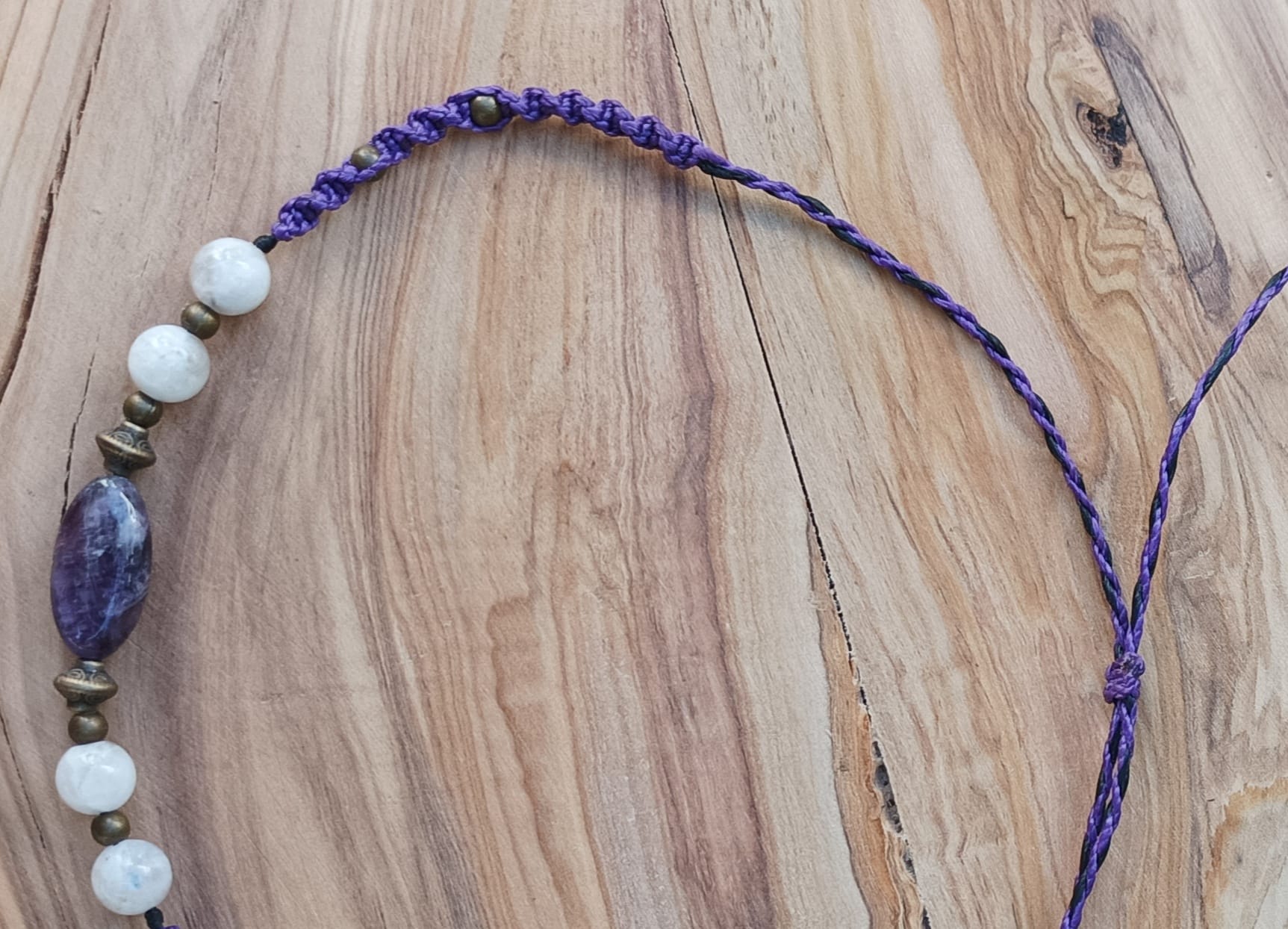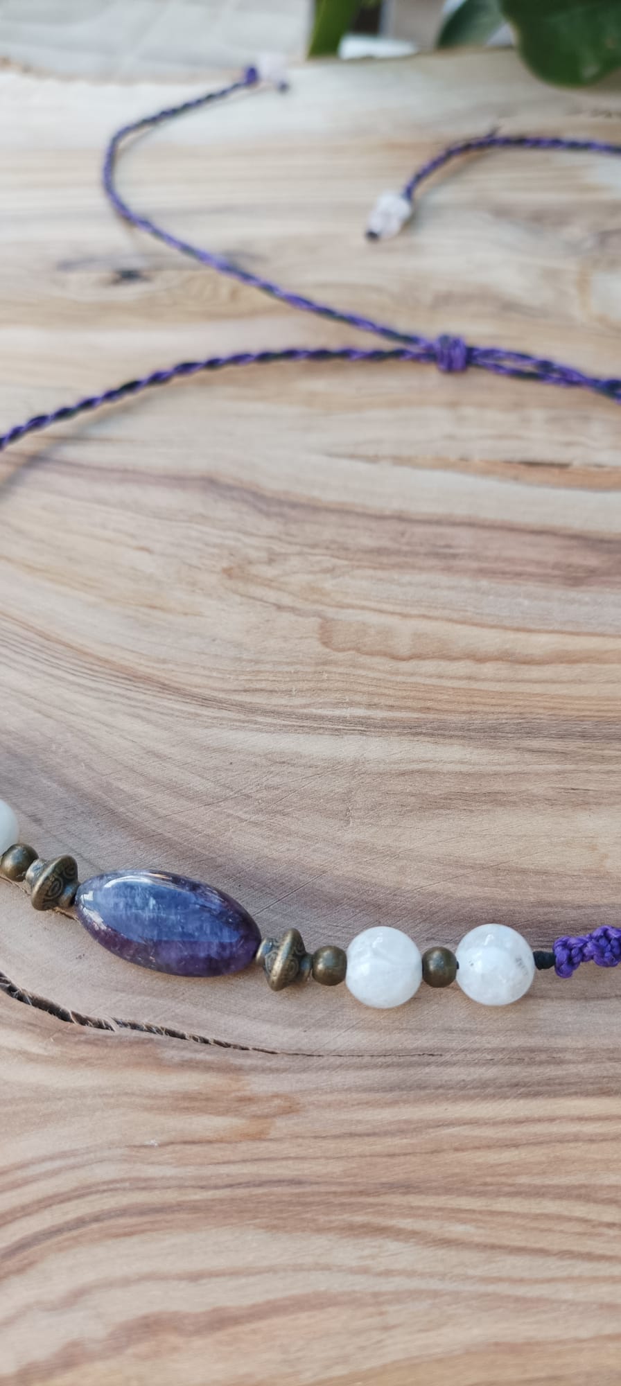 Collar- choker de piedra amatista y piedra luna, con detalles en bolitas de latón, el cordón es con cierre ajustable, y en sus extremos detalle de piedritas de cuarzo rosa.