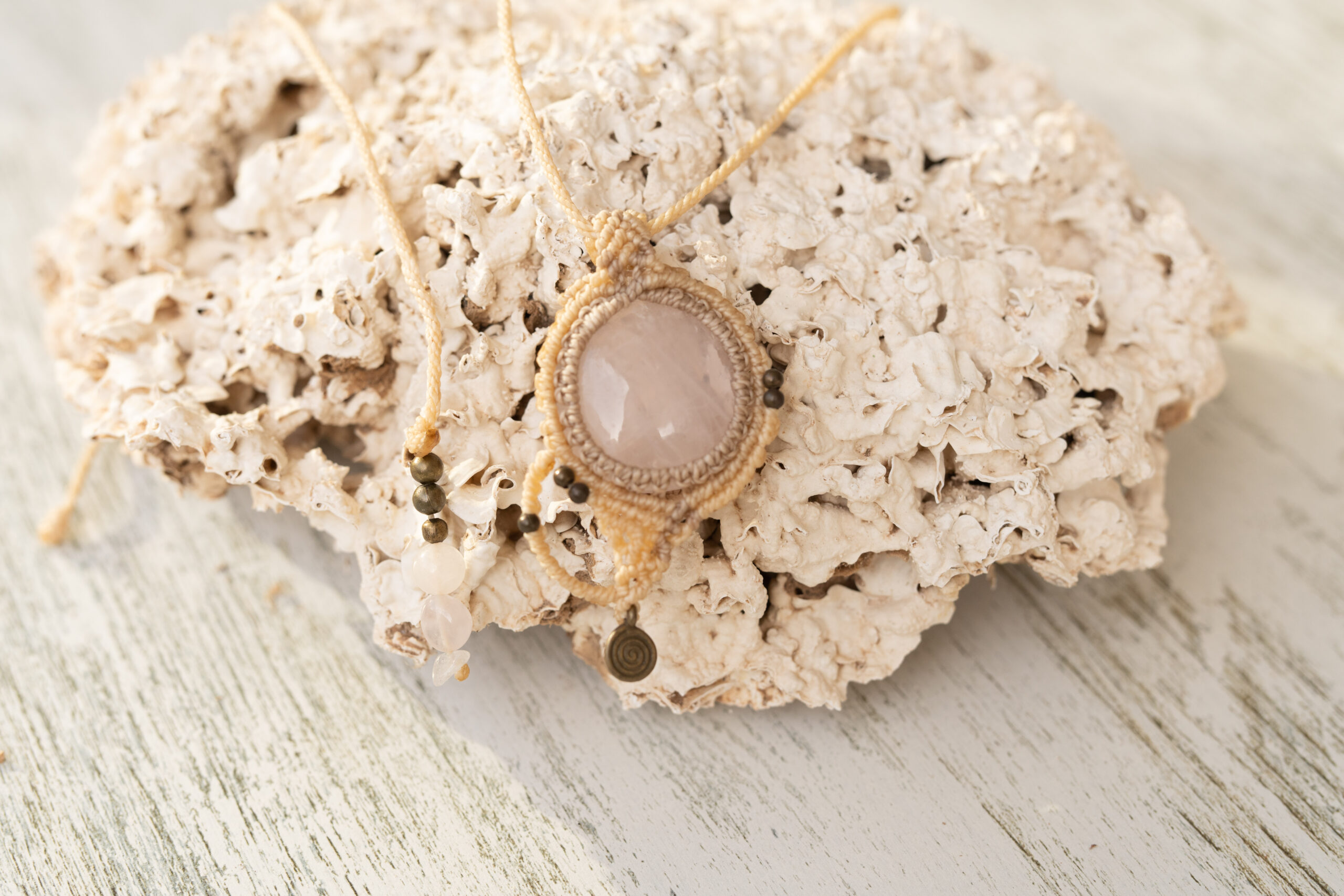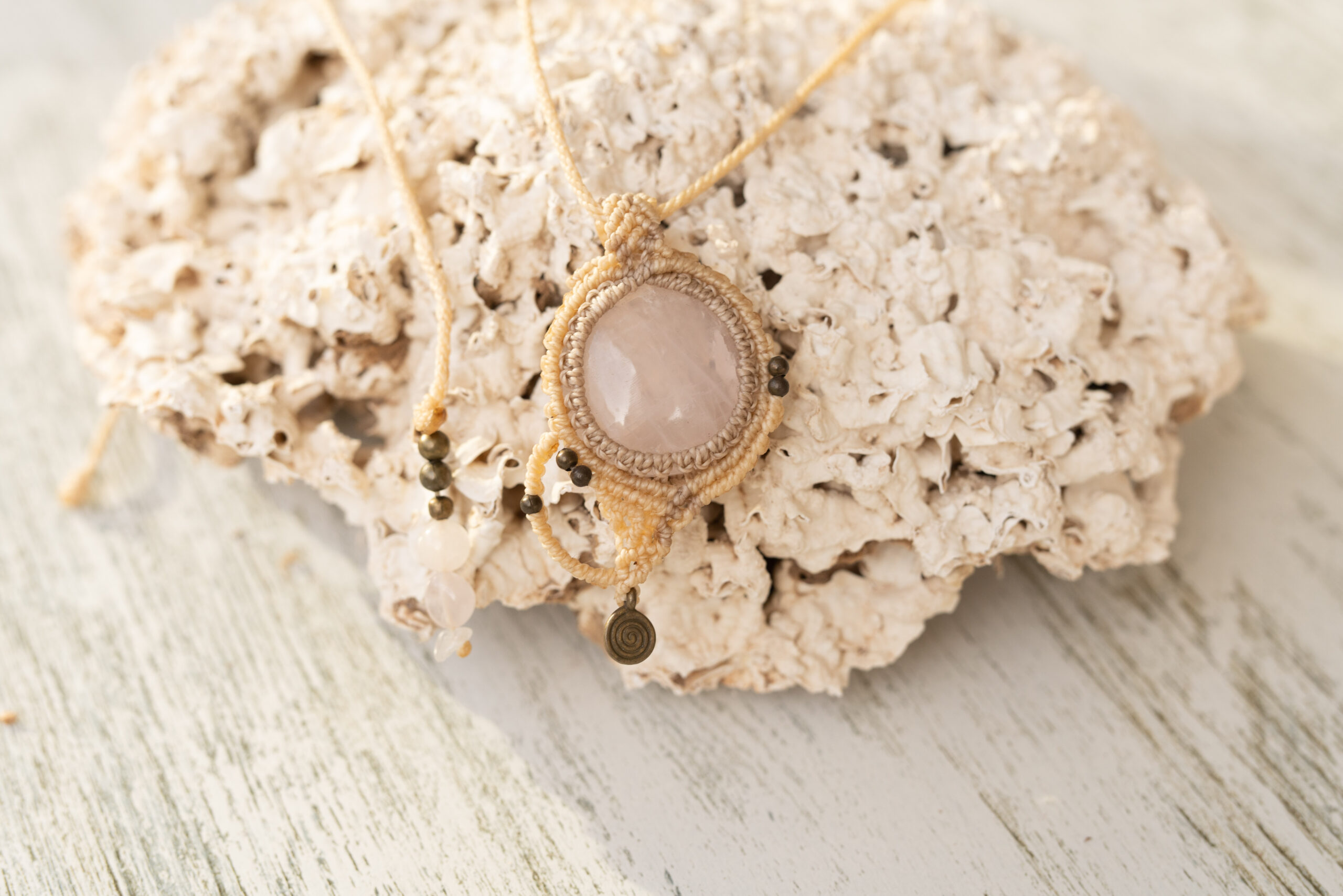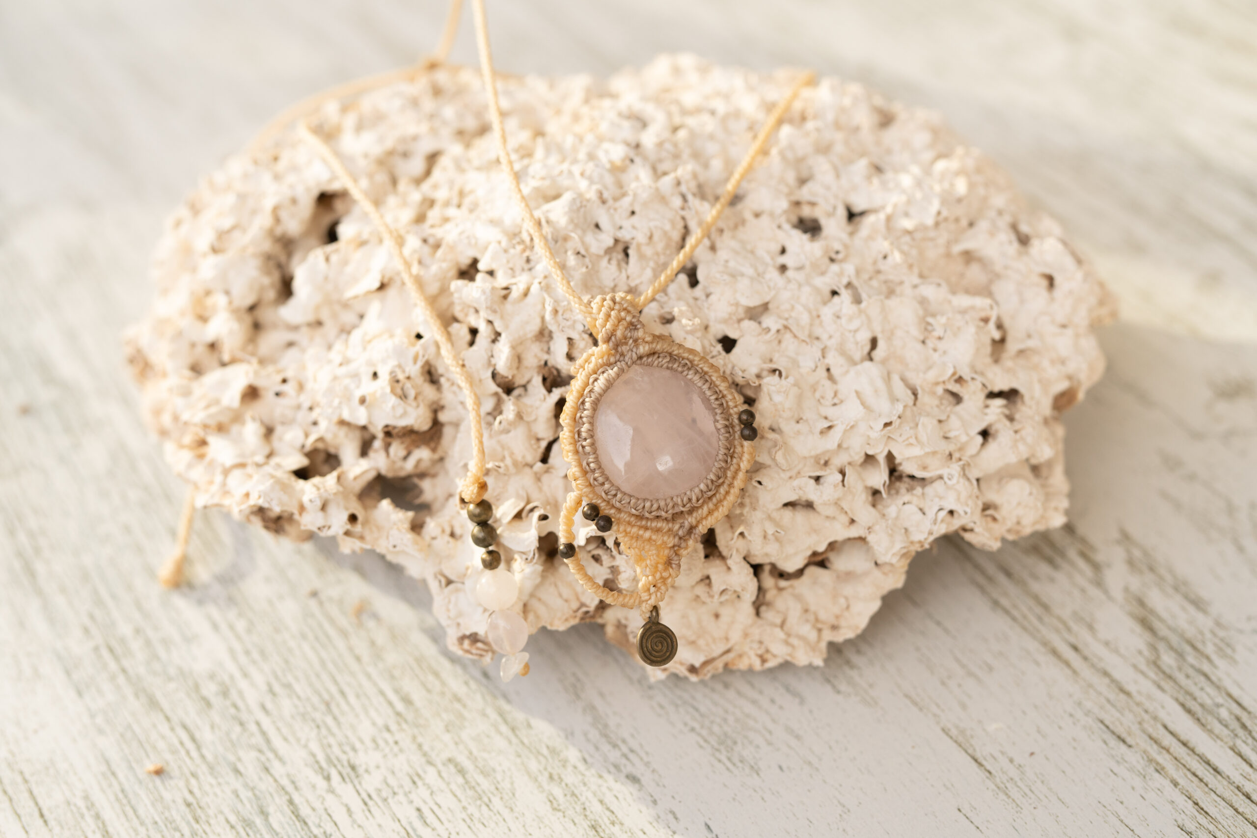 Collar de macramé con hilo encerado piedra en cuarzo rosa, y detalle con bolitas de latón y cordón ajustable con terminación con piedras de cuarzo rosa y bolitas de latón.