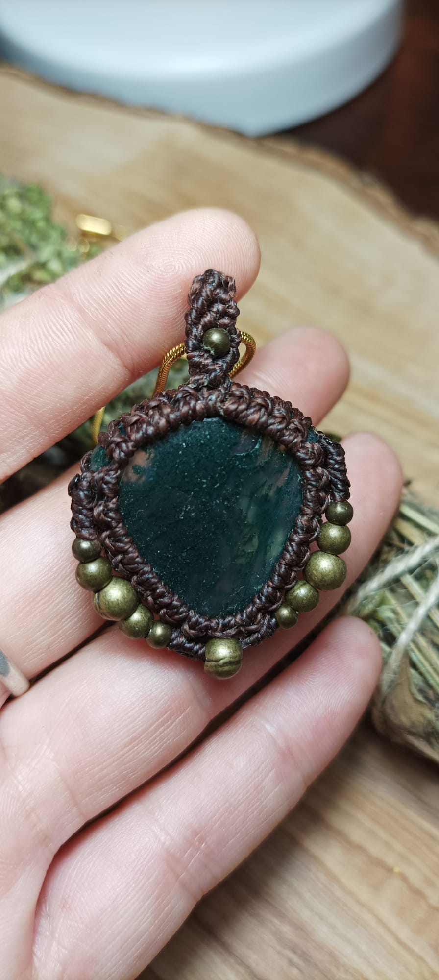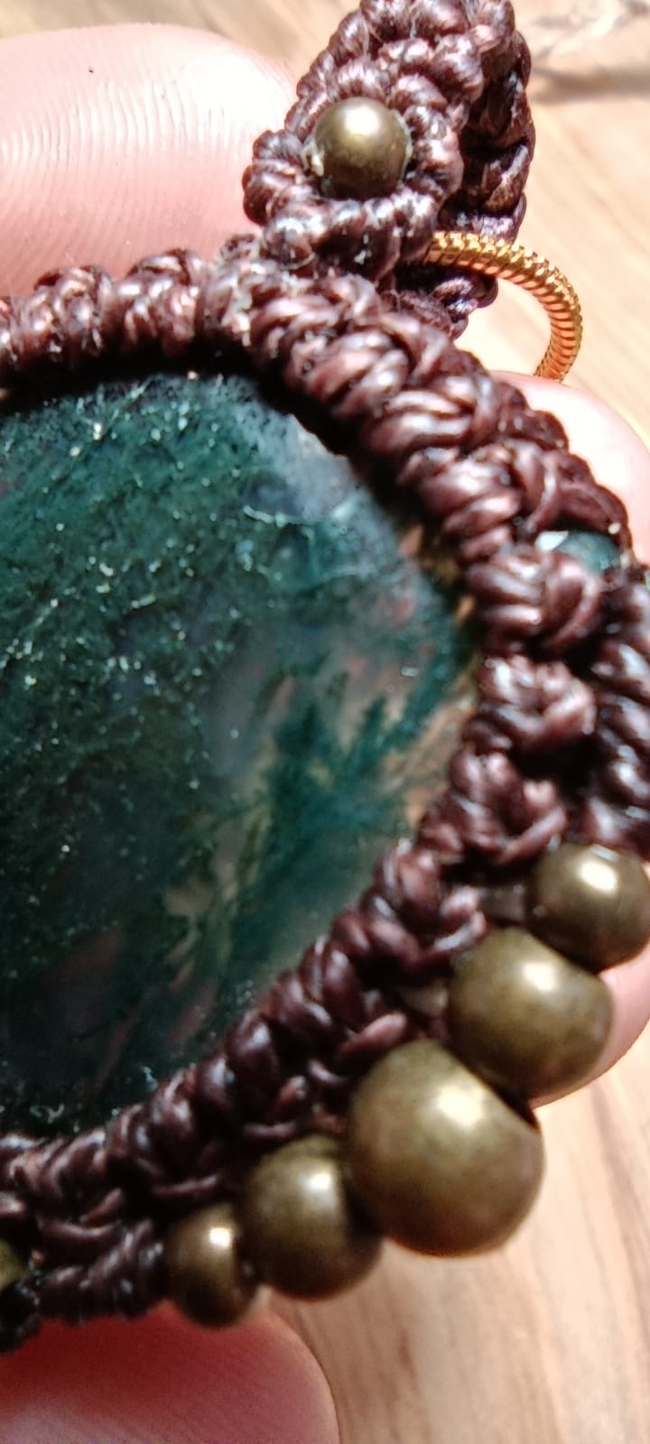 Collar de piedra Ágata Musgo, el engarce es con hilo encerado y con detalle de bolitas de latón, esta colección va con cordón de acero pintado dorado.