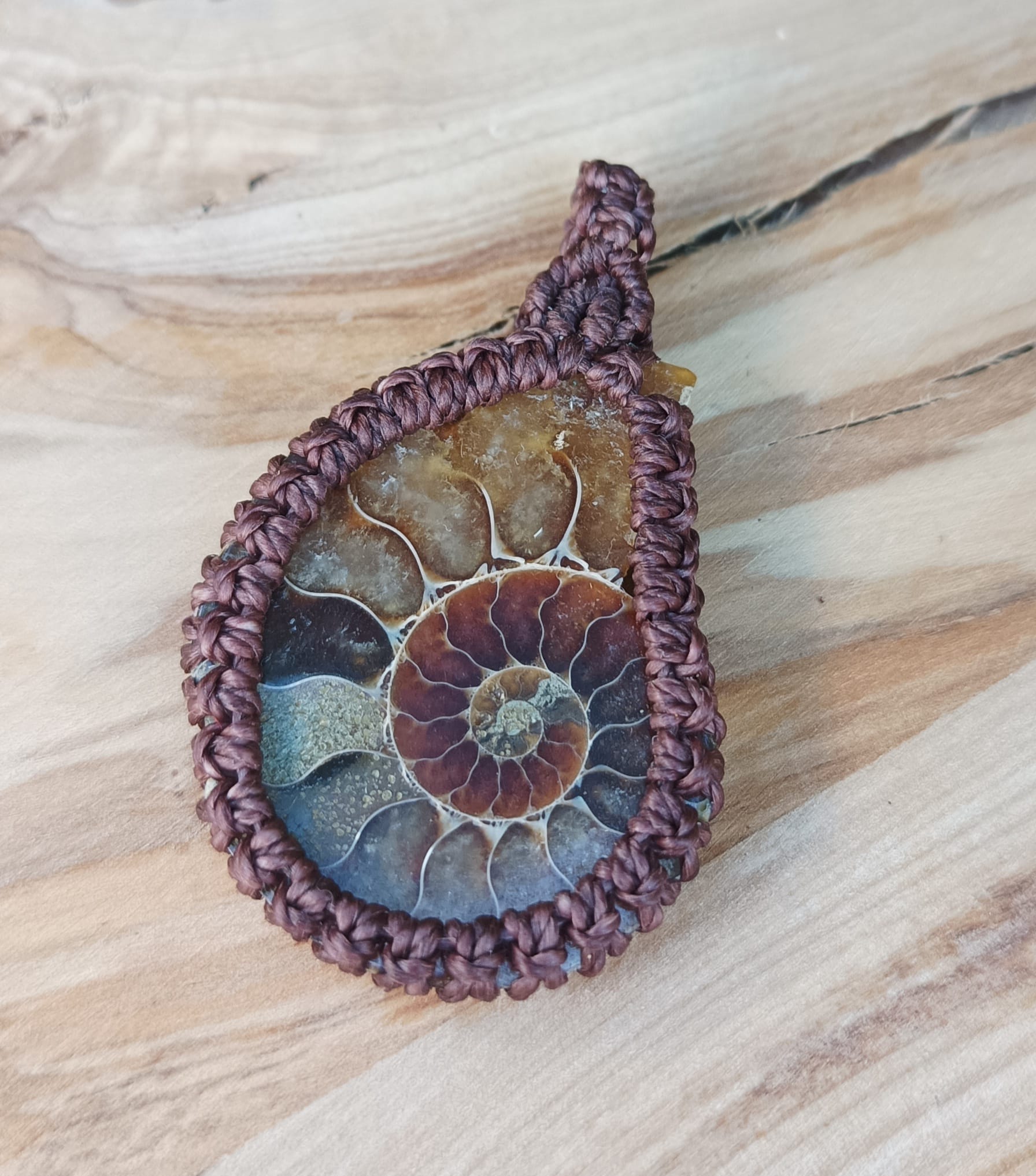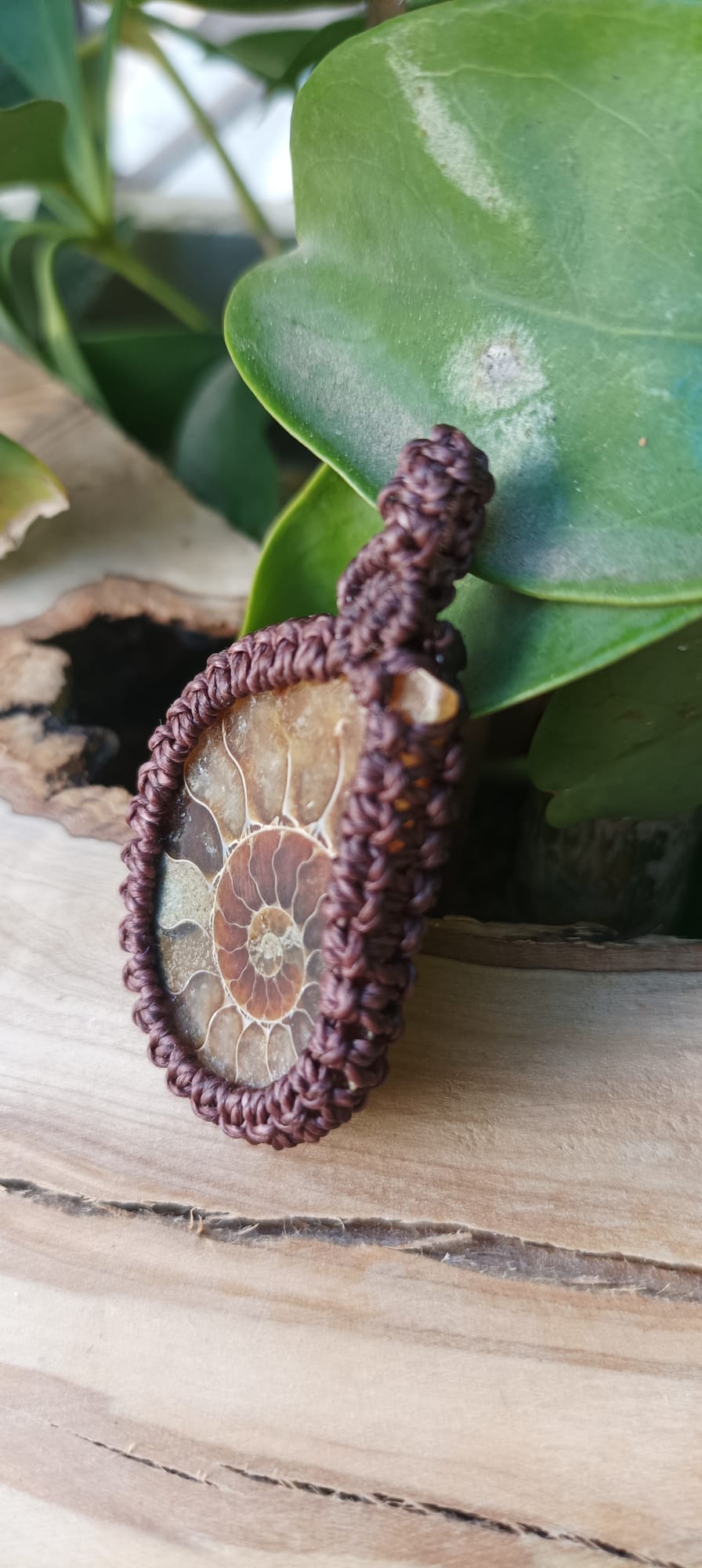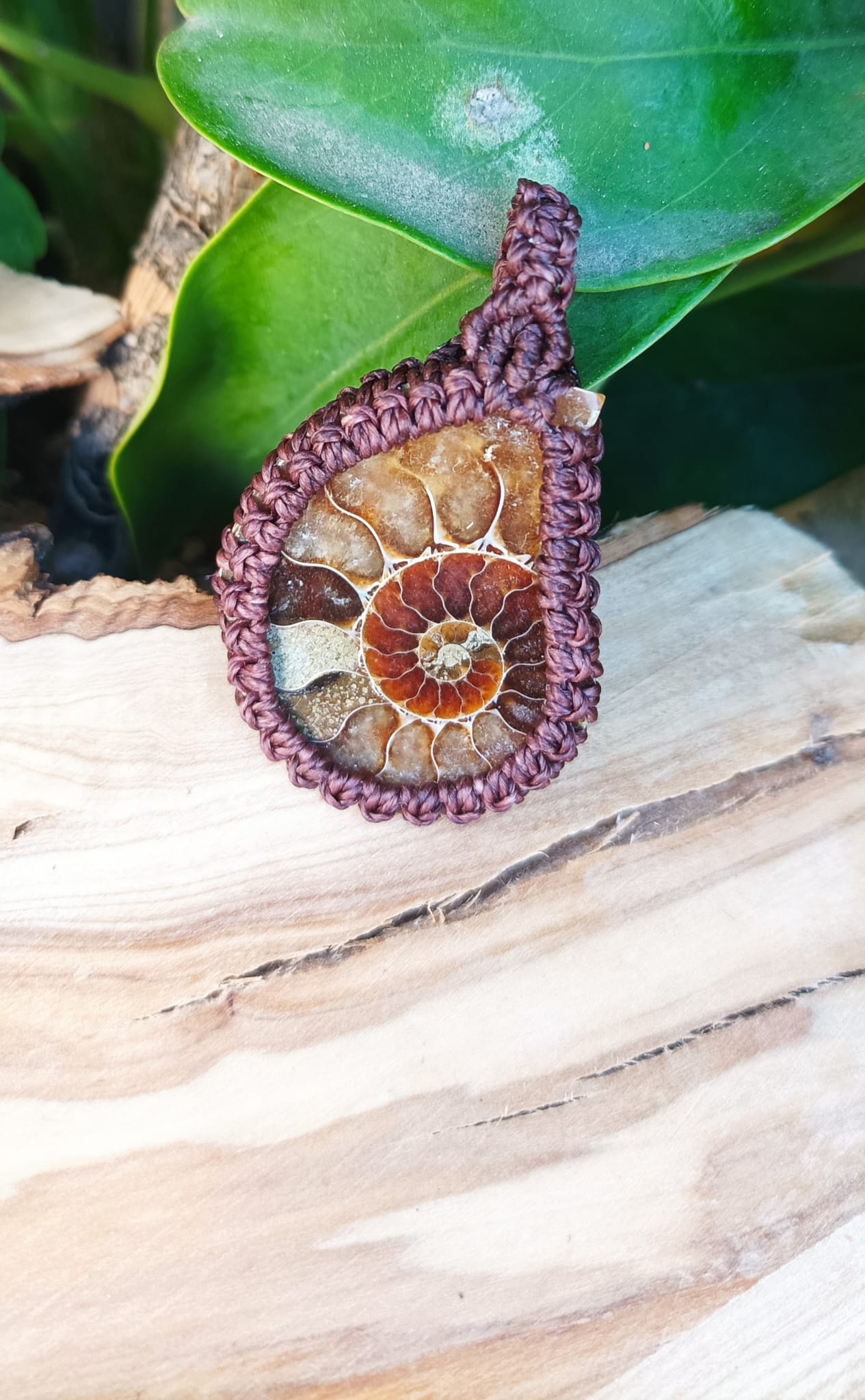 Collar de Fósil de Amonite engarzado en macramé con hilo encerado, el cordón lleva cierre ajustable.