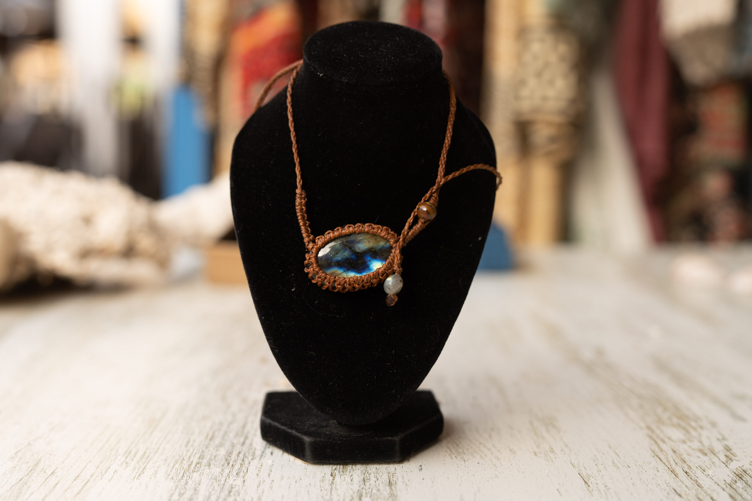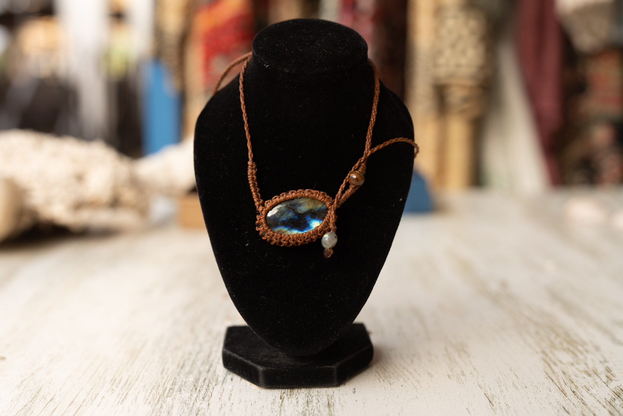 Collar de macramé con hilo encerado, haciendo un bonito engarce con piedra labradorita y detalle ojo de tigre, cordón ajustable con detalle final de labradorita.